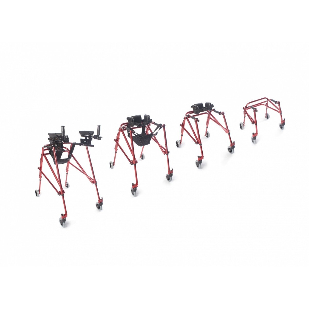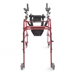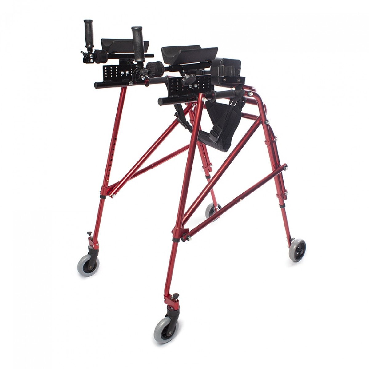 Ходунки легко адаптируются под ребёнка: можно отрегулировать высоту и настроить элементы поддержки под индивидуальные особенности. Дополнительные фиксаторы корпуса и таза помогают удерживать стабильное положение, а подлокотники дают уверенную опору при движении. Модель подходит для использования как в процессе реабилитации, так и в повседневной активности.