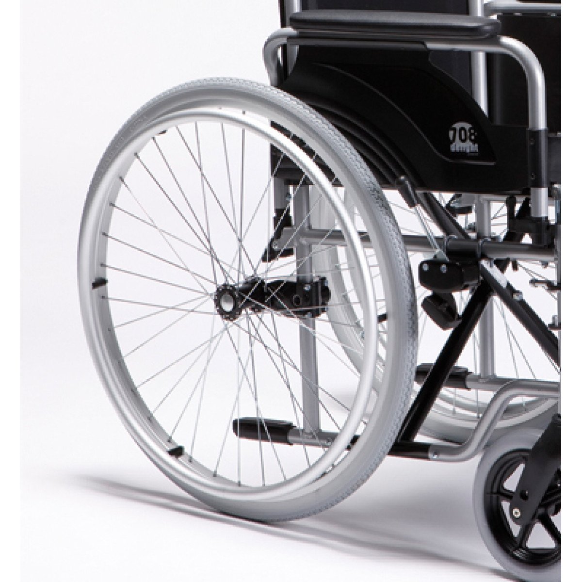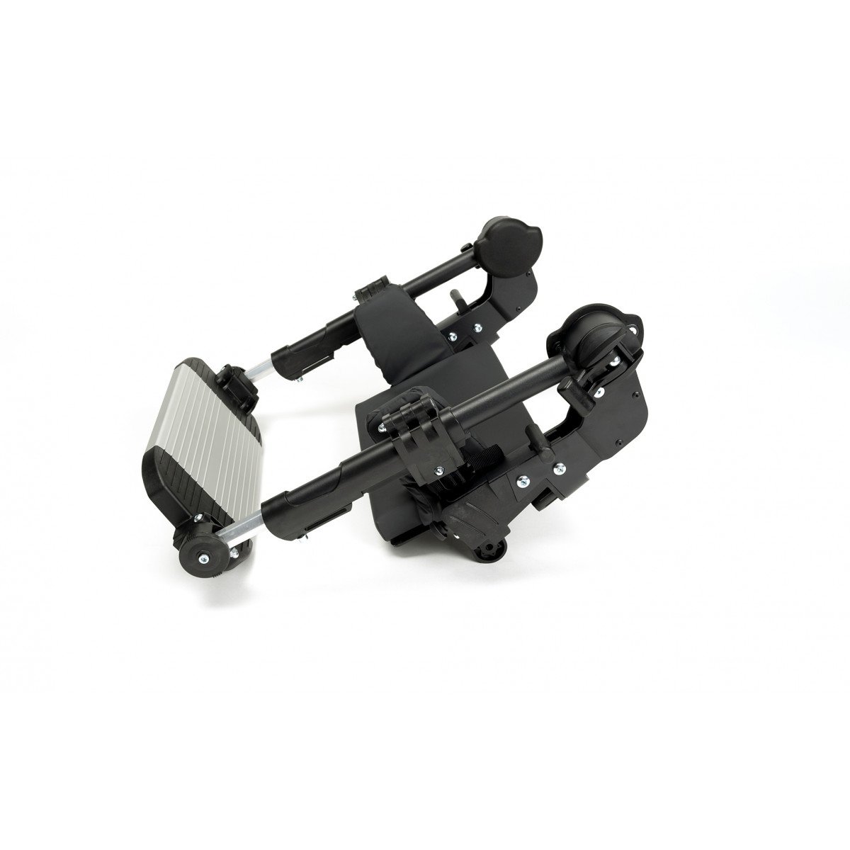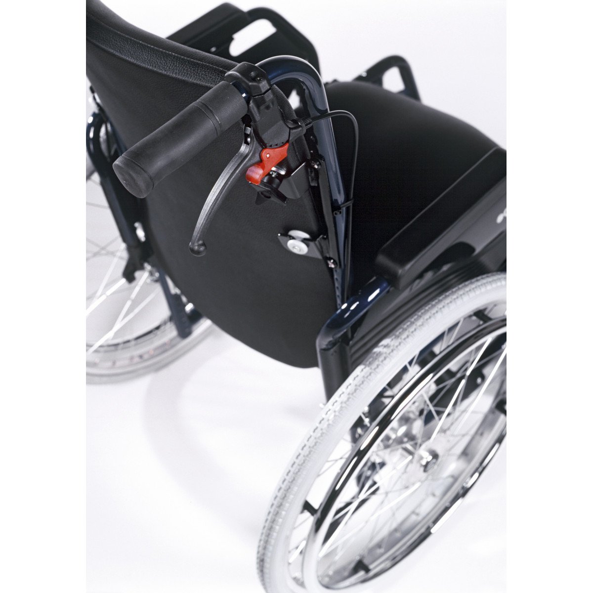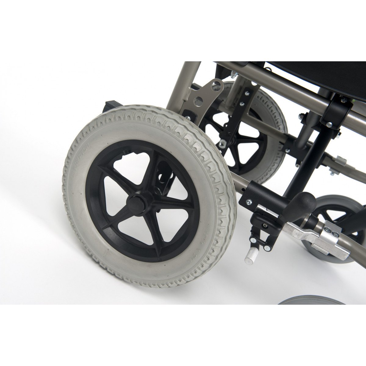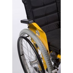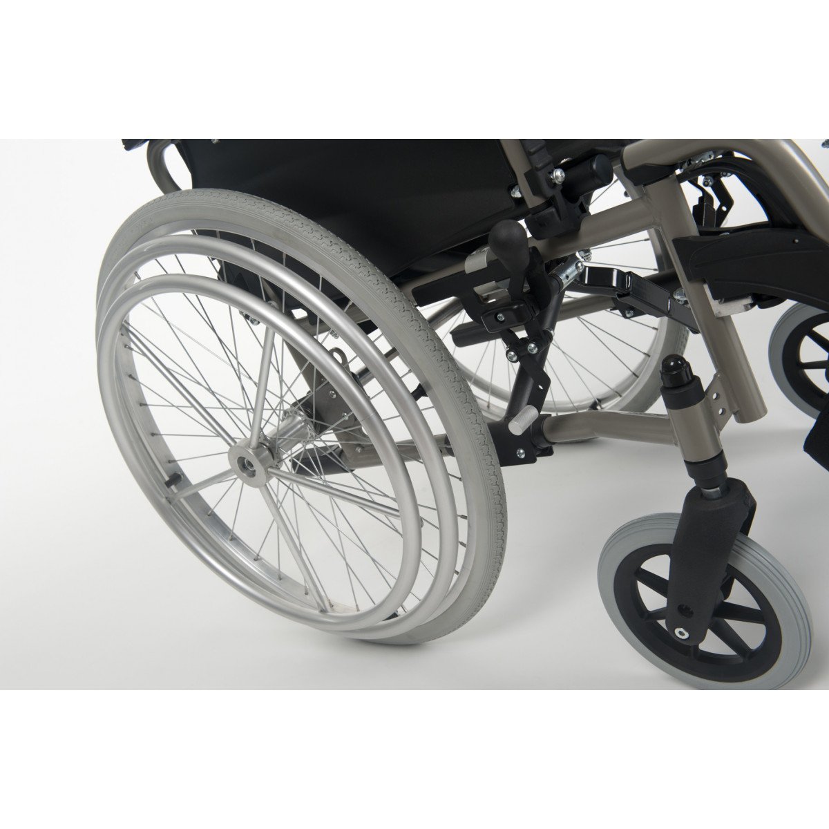 Коляска может быть укомплектована как литыми, так и пневматическими колёсами, которые легко снимаются. Использование специальных адаптеров позволяет варьировать высоту и глубину колёсной базы, что даёт возможность настроить коляску на более маневренную или, наоборот, устойчивую. В конструкции предусмотрены съёмные откидные защитные щитки и подлокотники с регулировкой высоты. Подножки также съёмные и имеют регулировку длины, с возможностью складывания как внутрь, так и наружу. Кроме того, в коляске предусмотрена возможность регулировки центра тяжести. Коляска также оснащена ручным стояночным тормозом, который обеспечивает дополнительную безопасность при остановке.