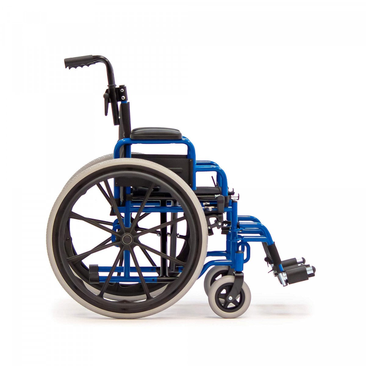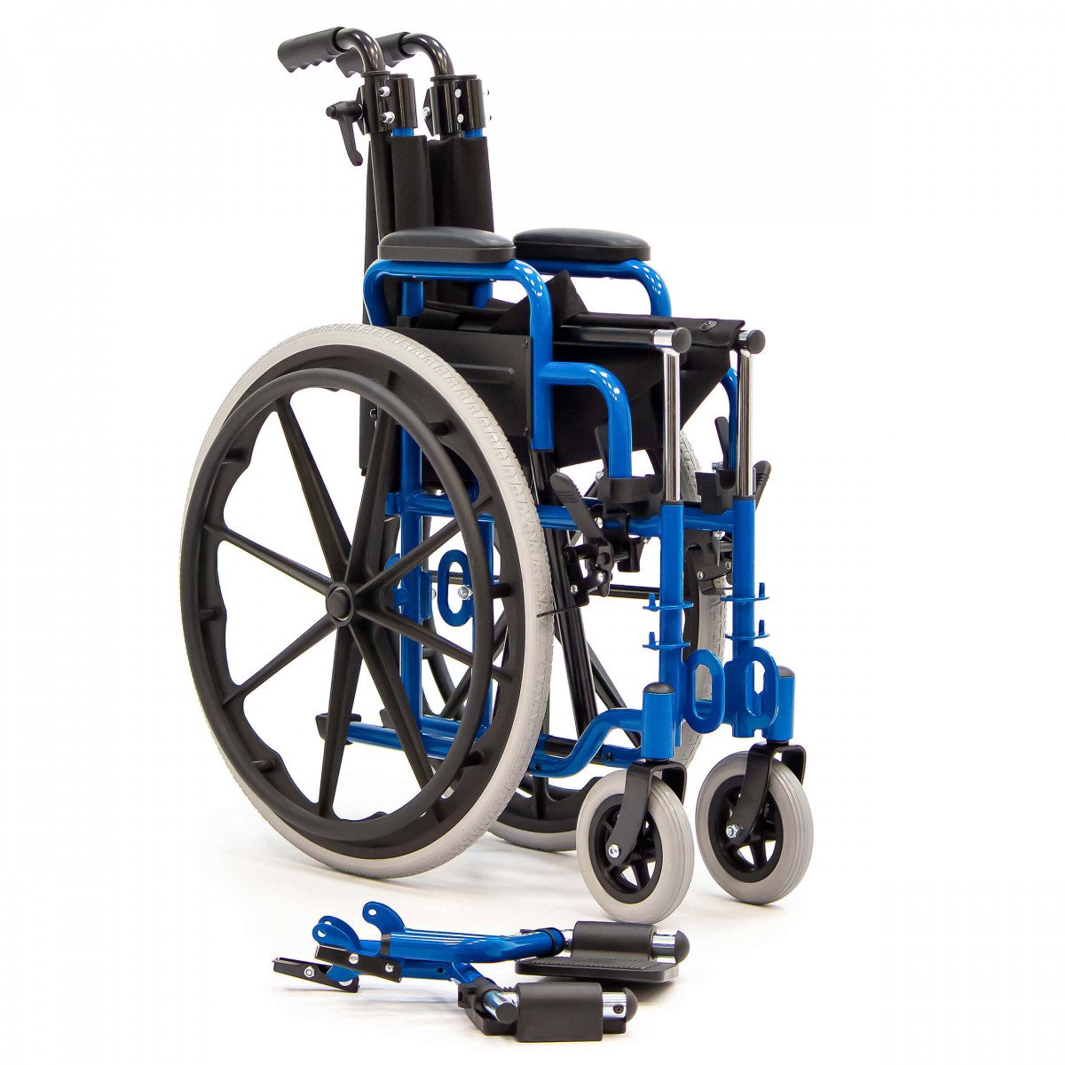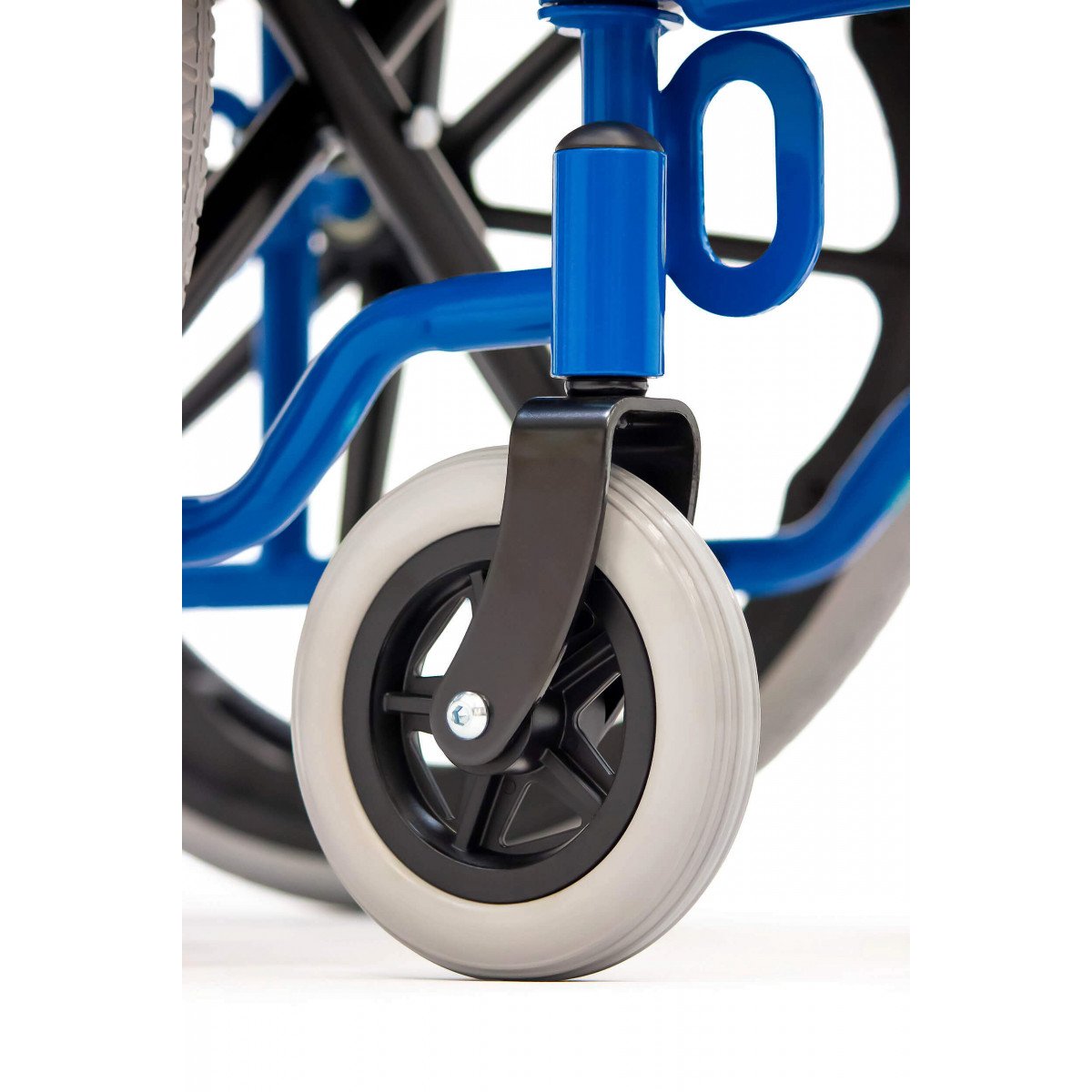 Сиденье и спинка выполнены из прочного нейлона, который устойчив к износу и прост в уходе. Литые колёса не требуют обслуживания и обеспечивают надёжность в ежедневном использовании. Для безопасной остановки предусмотрены боковые стояночные тормоза.