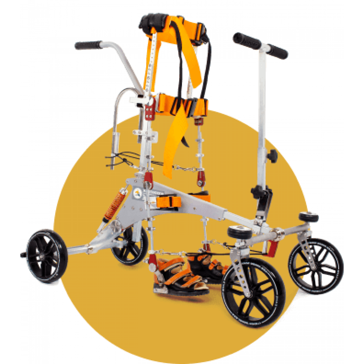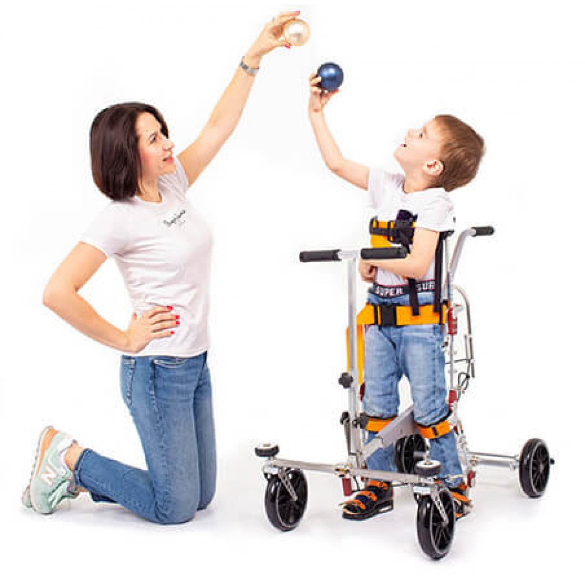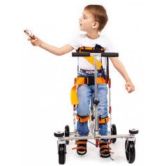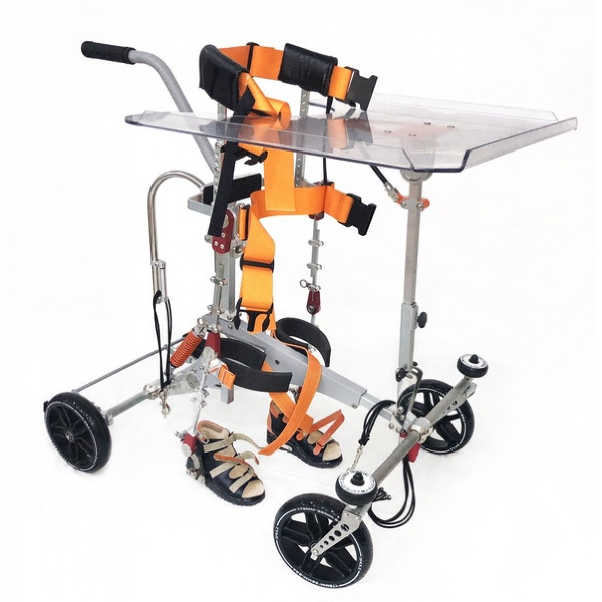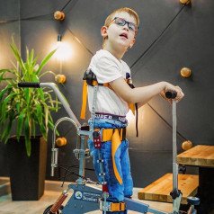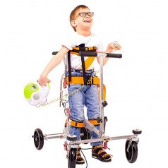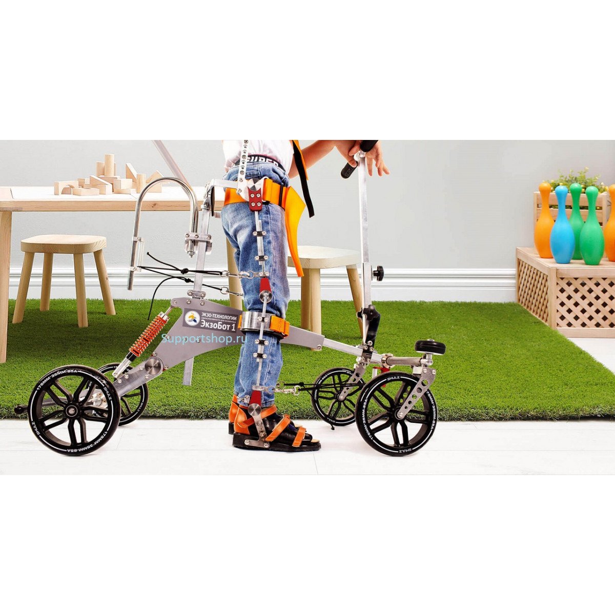 ЭкзоБот – комплексное медицинское устройство для пользователей с проблемой контроля баланса туловища и патологического паттерна шага. Тренажёр выполняет не только функцию вертикализатора, но и обладает функцией ходунков-ролаторов с формированием правильного паттерна шага, а именно, ходьбу с пятки. Устройство позволяет удерживать вертикальное положение тела и тренировать самостоятельную ходьбу. Экзобот состоит из двух частей: динамической опоры на колёсах и экзо-ортеза, который надёжно фиксирует суставы нижних конечностей и грудную клетку.