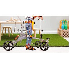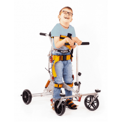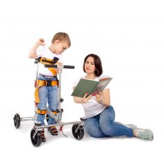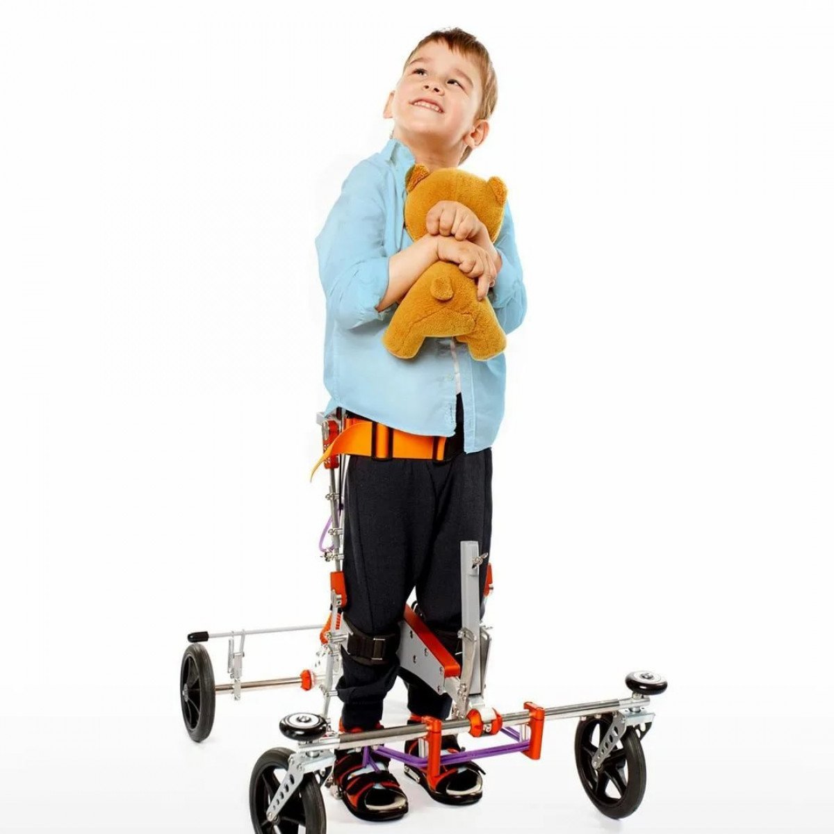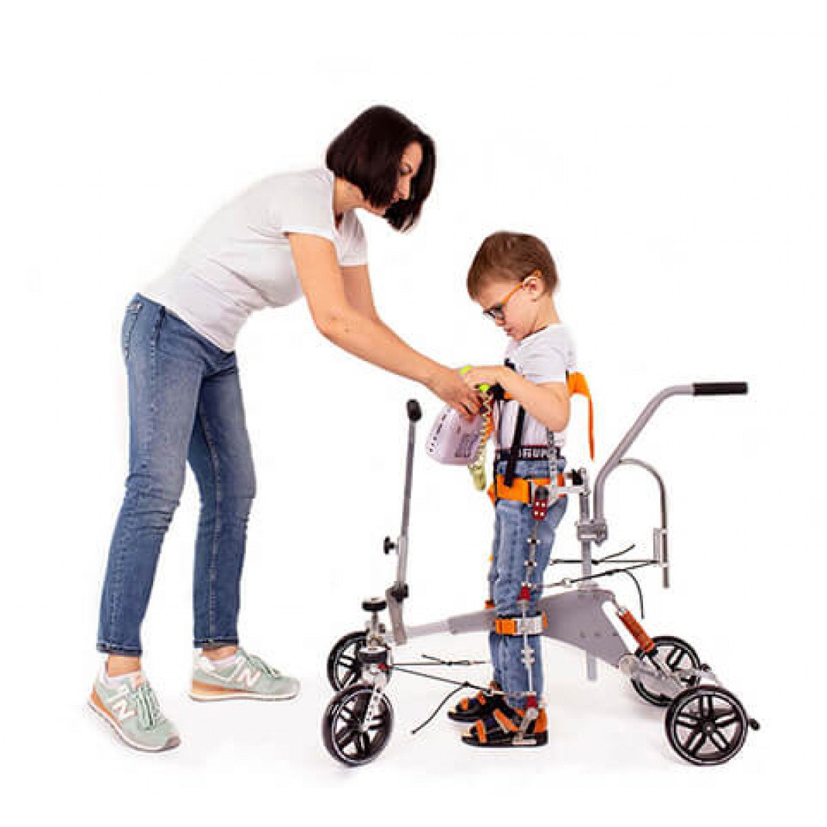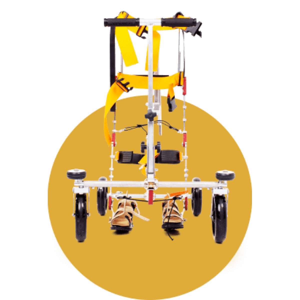 ЭкзоБот – комплексное медицинское устройство для пользователей с проблемой контроля баланса туловища и патологического паттерна шага. Тренажёр выполняет не только функцию вертикализатора, но и обладает функцией ходунков-ролаторов с формированием правильного паттерна шага, а именно, ходьбу с пятки. Устройство позволяет удерживать вертикальное положение тела и тренировать самостоятельную ходьбу. Экзобот состоит из двух частей: динамической опоры на колёсах и экзо-ортеза, который надёжно фиксирует суставы нижних конечностей и грудную клетку.