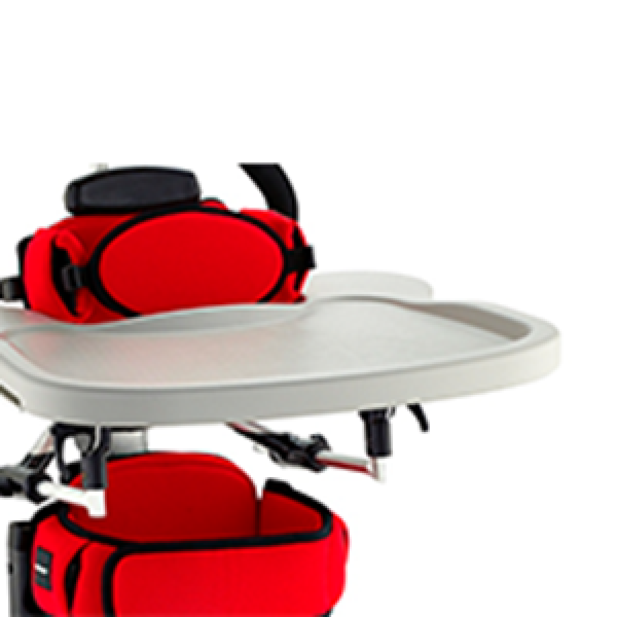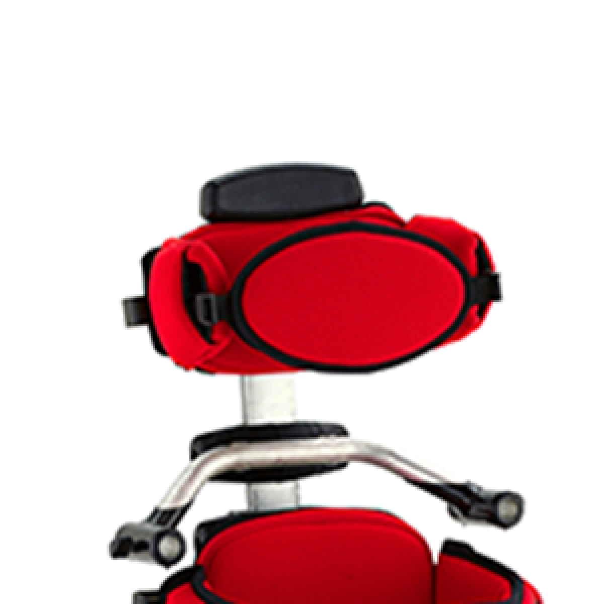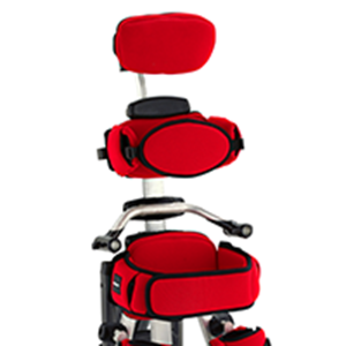 - Комплект 4 (цвет красный): шасси на колёсах, подголовник с боковыми поддержками, стол, опоры для стоп, сандалии маленькие, фиксаторы грудного отдела, туловища, коленей