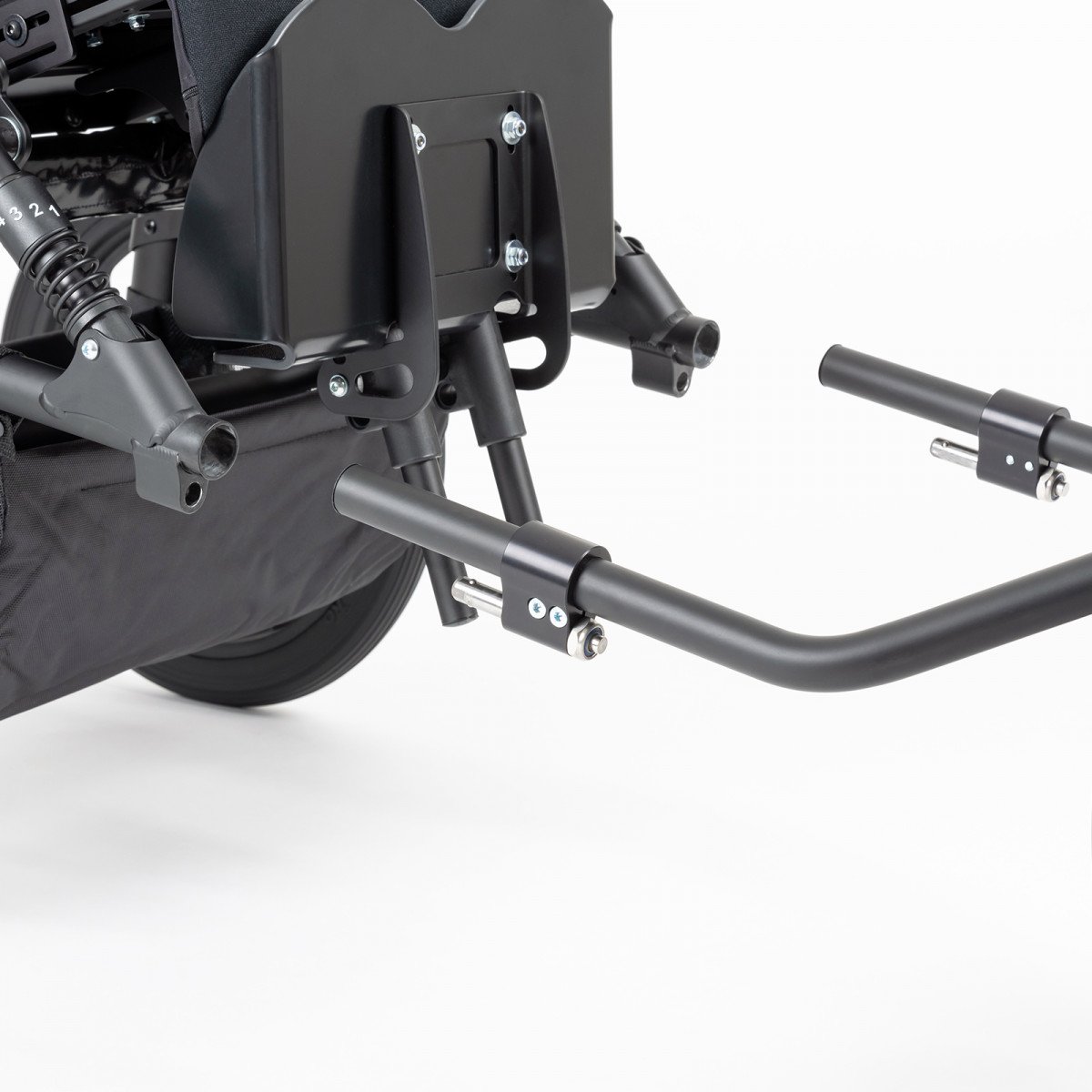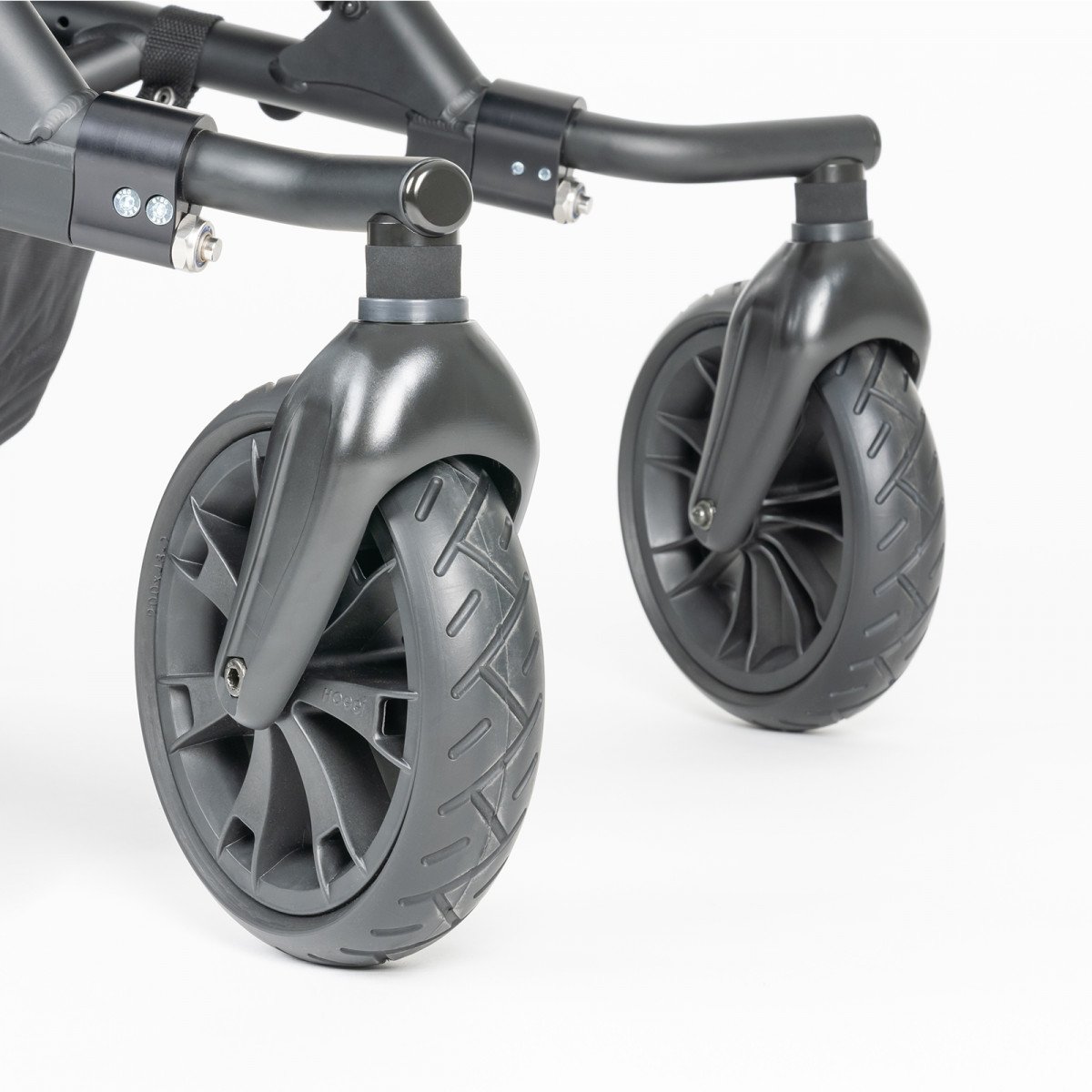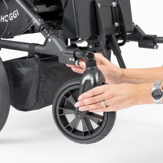 Уникальный встроенный быстросъёмный механизм позволяет пользователю быстро и удобно менять конфигурацию передней части коляски. Можно установить либо одно, либо два колеса спереди, что значительно улучшает маневренность. Например, в условиях узких мест или на неровных поверхностях можно выбрать одно колесо, облегчая управление и навигацию. В то же время, для большей устойчивости и стабильности на ровной поверхности можно устанавливать два колеса.
