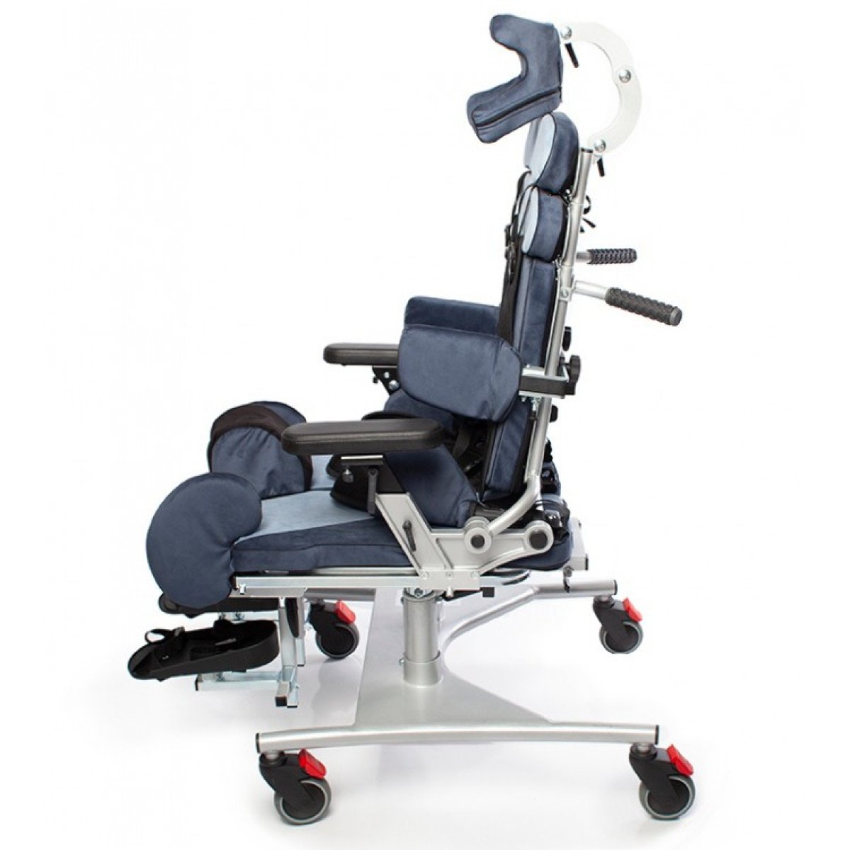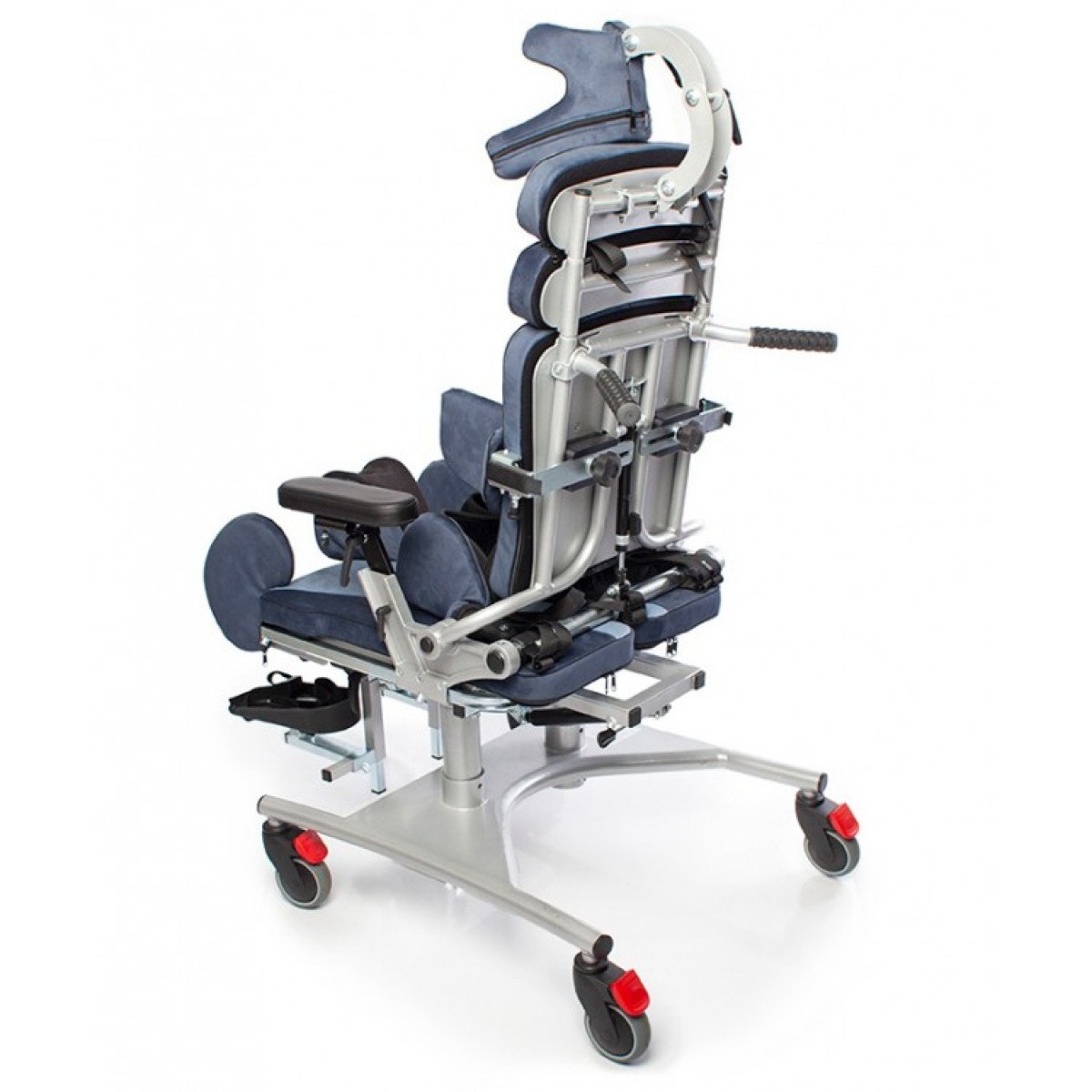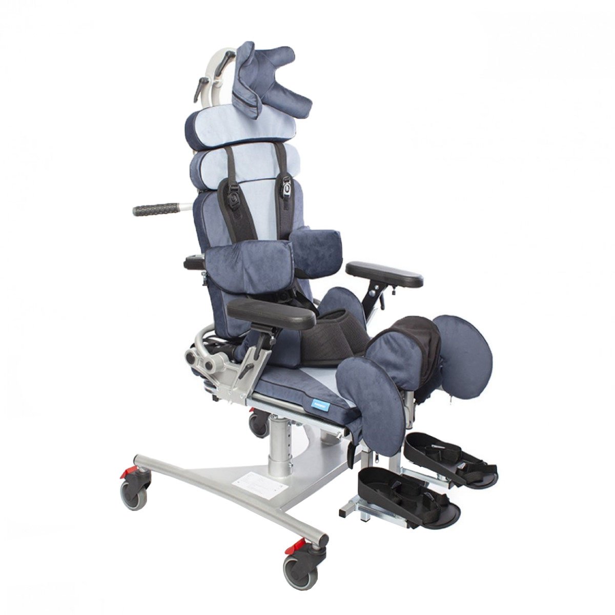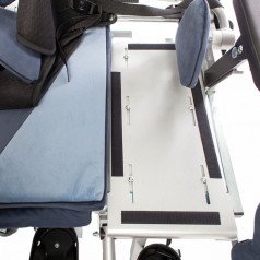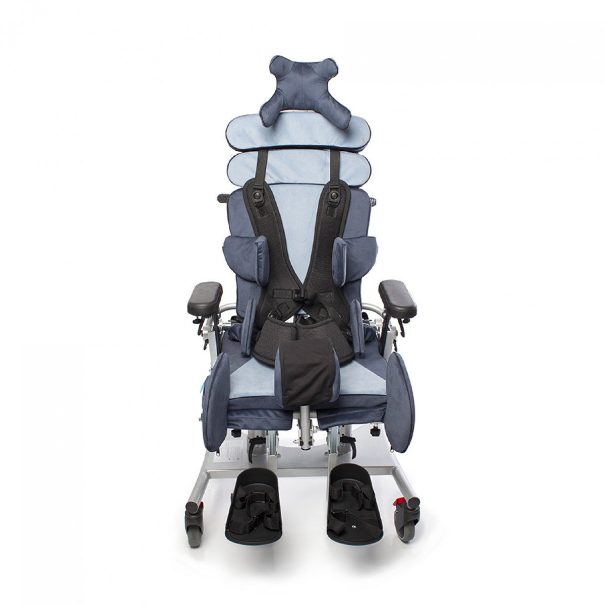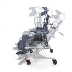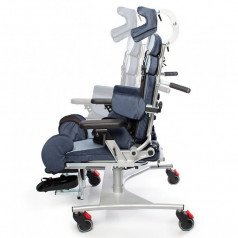 Кресло оснащено независимыми и регулируемыми упорами для тазобедренного сустава, которые можно настроить по ширине и углу наклона, что позволяет выбрать симметричную или асимметричную регулировку в зависимости от индивидуальных потребностей пользователя. Также предусмотрены тазовые ремни для дополнительной фиксации.