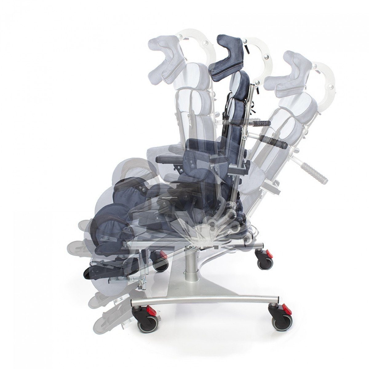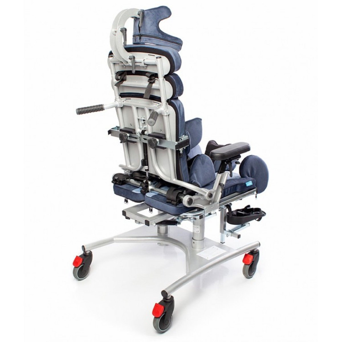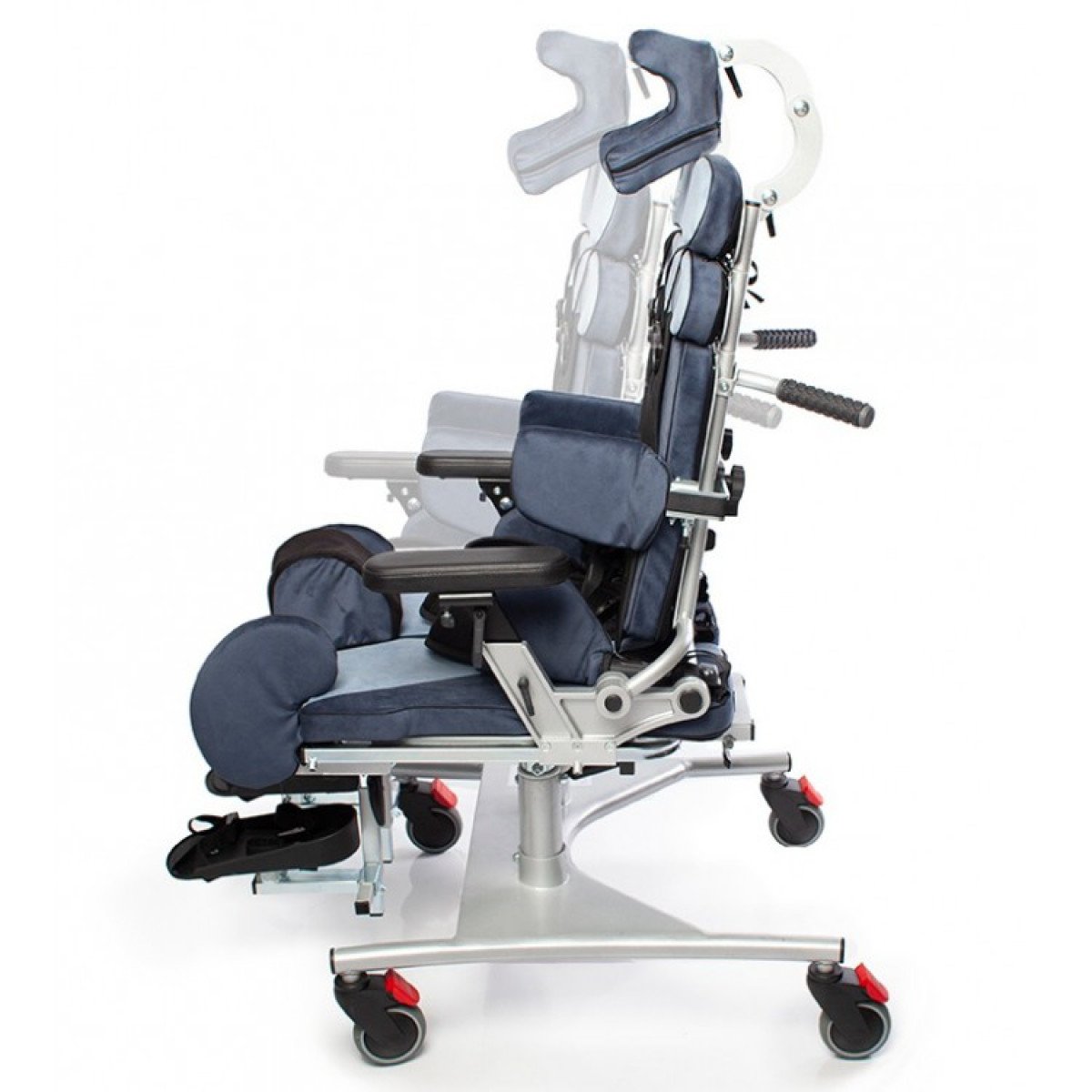 В конструкции кресла учтены поддерживающие элементы и система отведения ног, которая включает комбинацию упоров для коленей и механизм регулировки угла отведения. Это позволяет достичь наиболее комфортного и безопасного положения ног. Поясничные и боковые поддержки имеют широкий диапазон регулировок по высоте и ширине. Все параметры легко настраиваются благодаря удобным рукояткам.