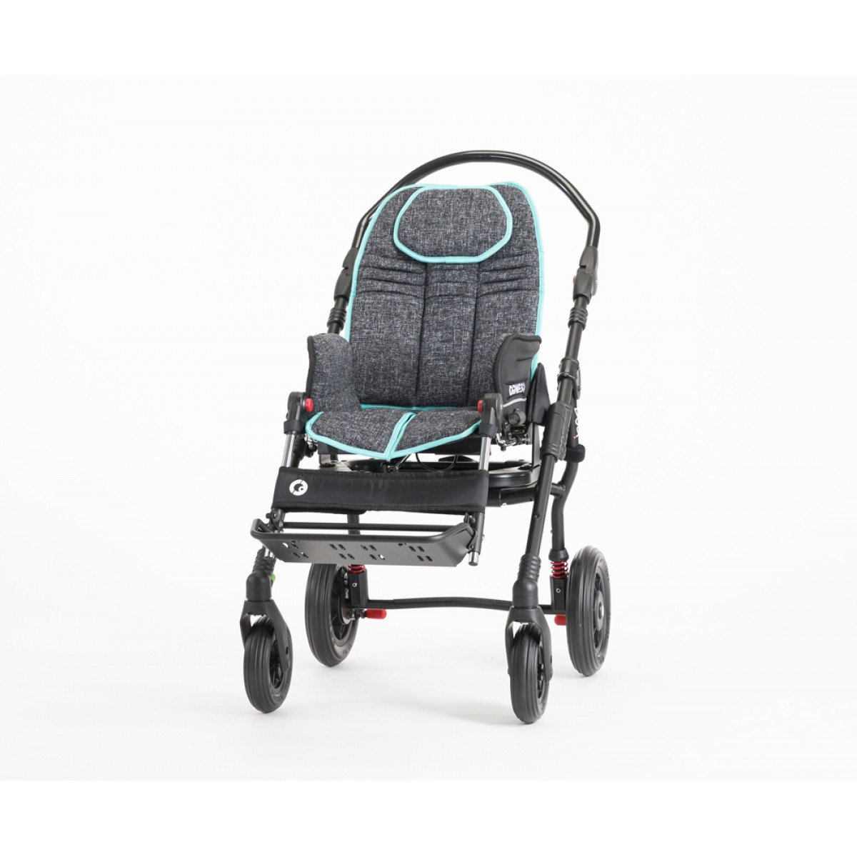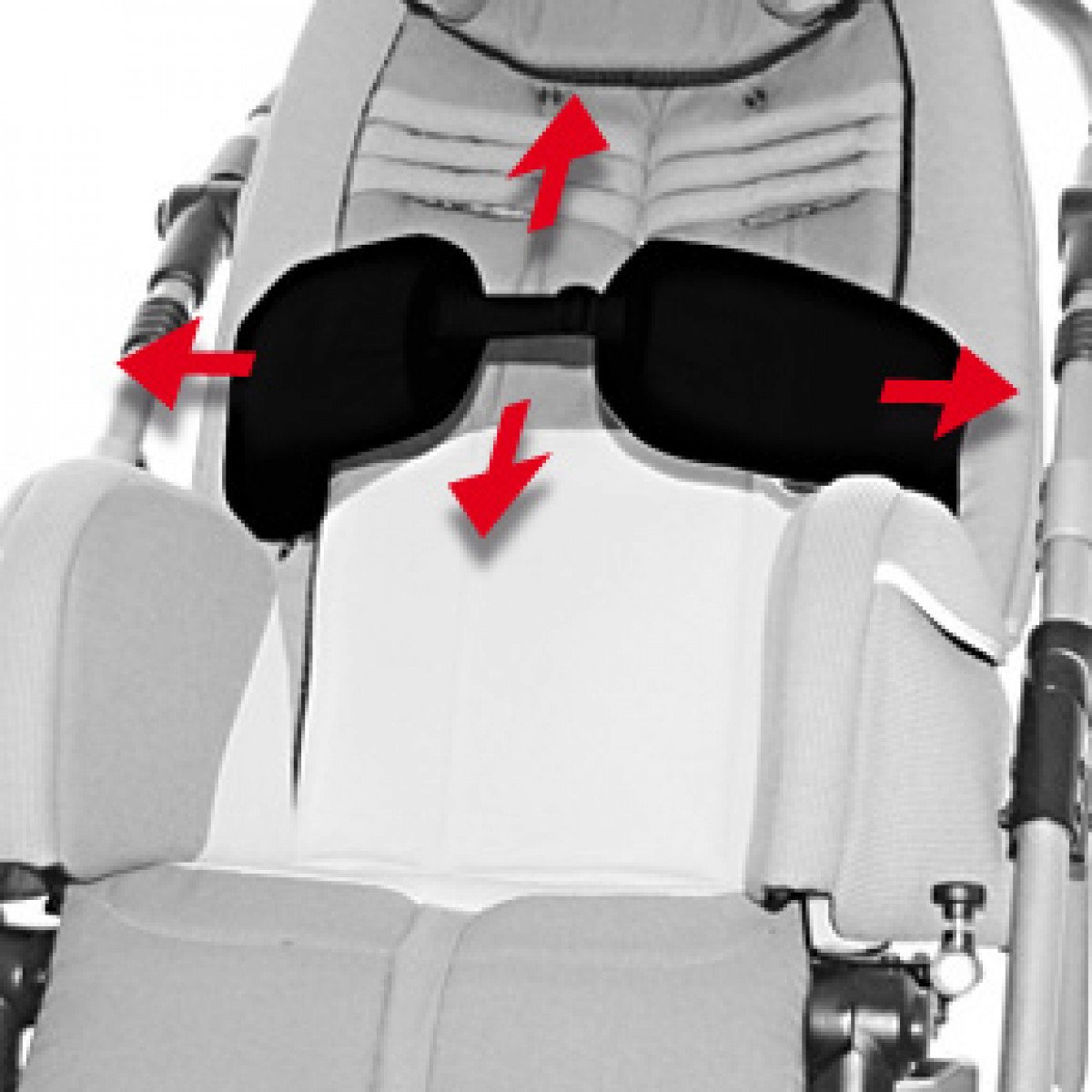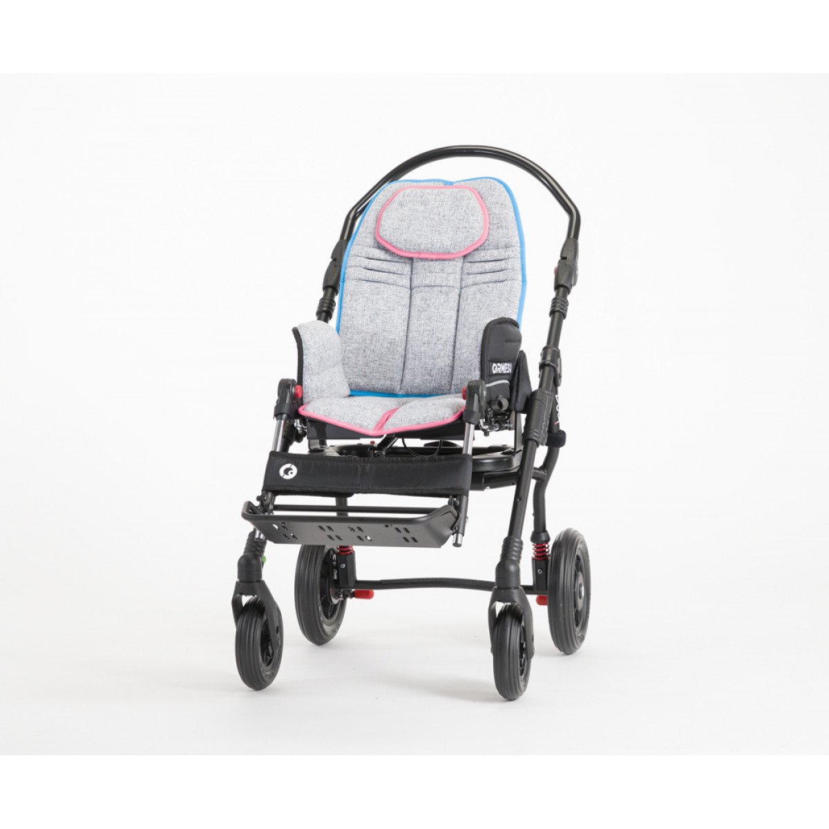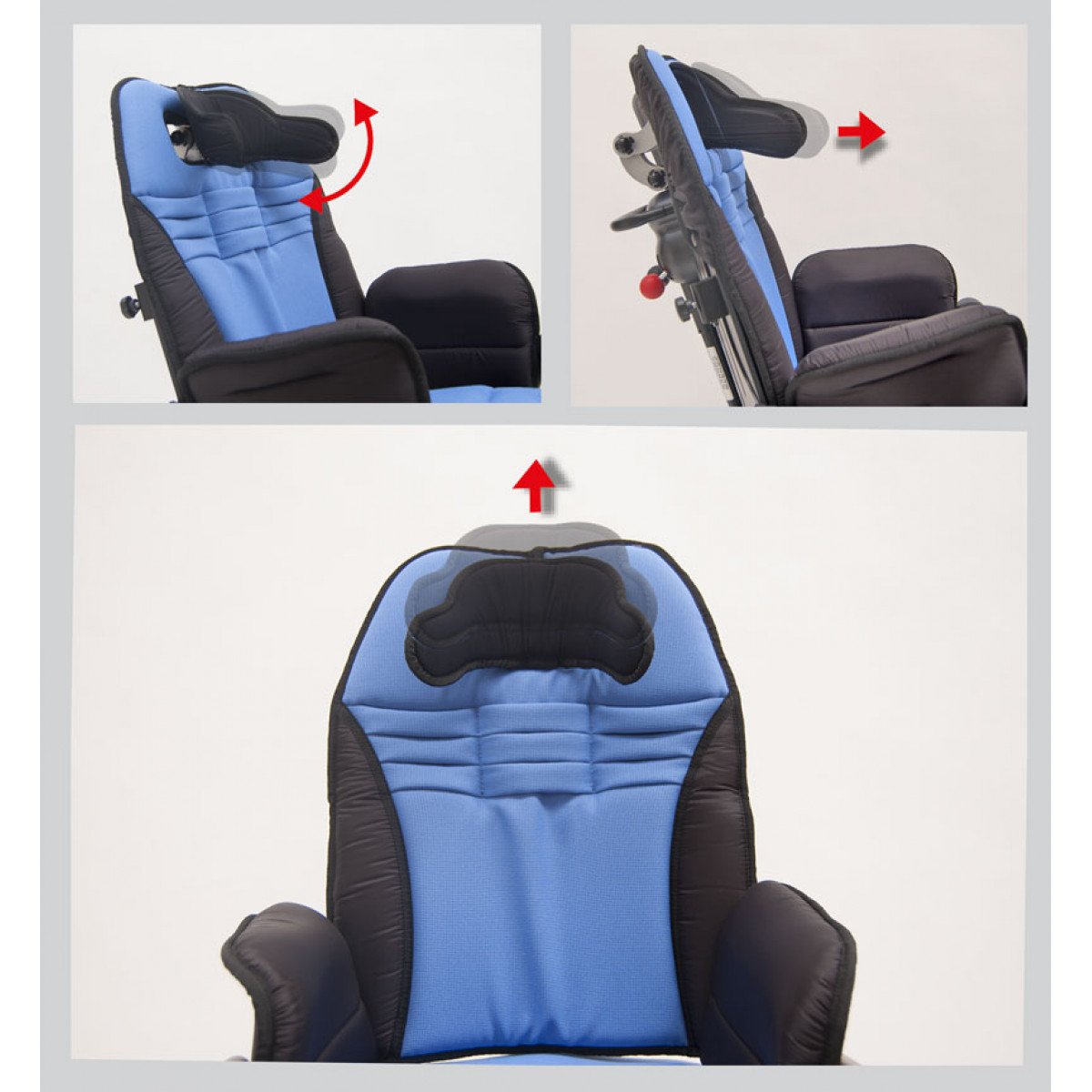 Жёсткая спинка с наклоном до 40° регулируется в высоту до 10 см. (размеры 1-2) и до 15 см. (размеры 3-4), соответствуя физиологическому изгибу тела. Откидная подножка имеет регулировку сгибания-разгибания, а опора для ног может настраиваться по высоте и углу, соответствуя физиологическому изгибу коленей. Встроенный подголовник, находящийся в спинке кресла, обеспечивает поддержание головы ребёнка во время любых изменений в положении сиденья и спинки.