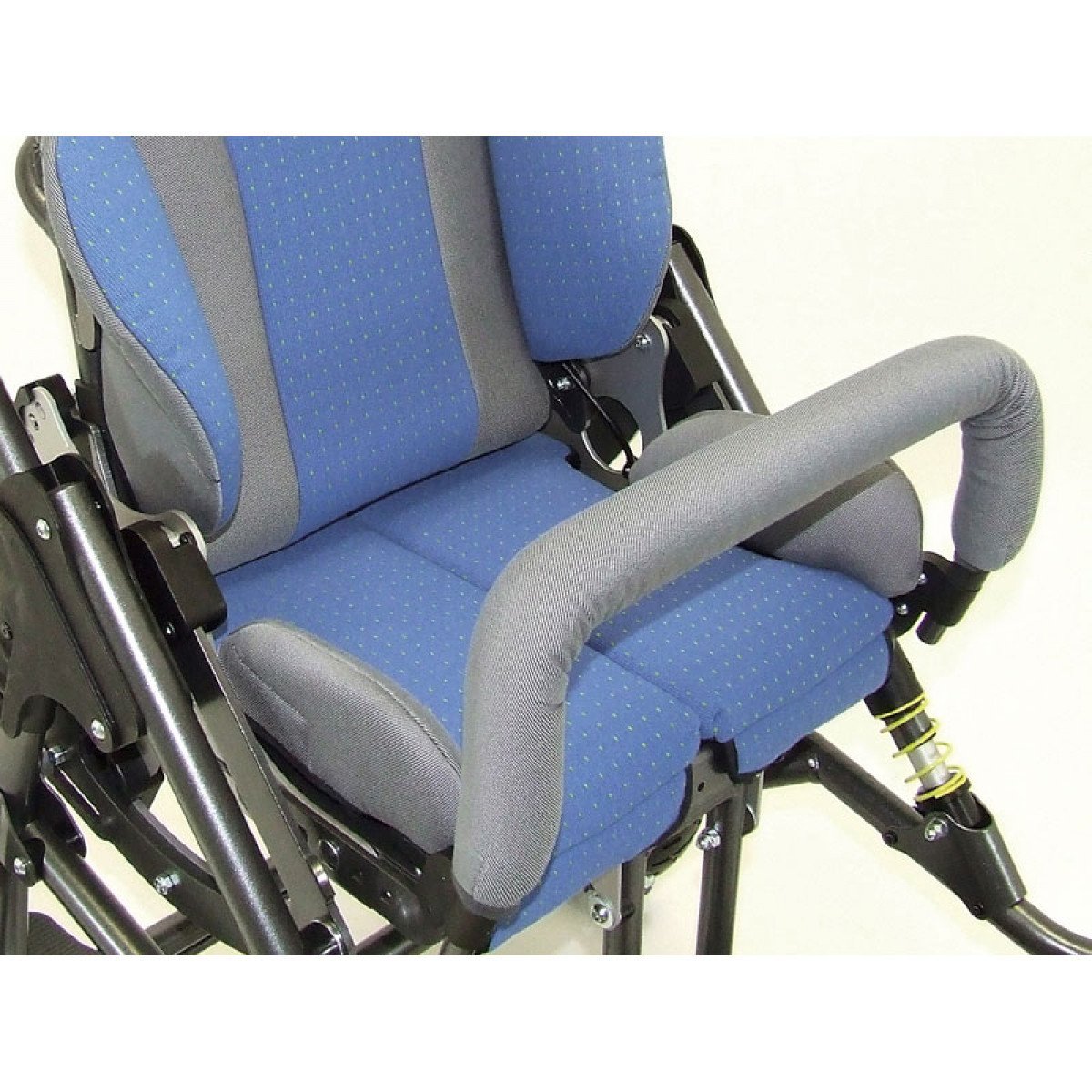 Кресло коляска для детей инвалидов оснащена съёмной мягкой обивкой в области сиденья, спины, головы и боковых бортов. Мягкая обивка обеспечивает удобство использования и легкость ухода за данным средством передвижения, так как её можно легко снять и почистить при возникновении такой необходимости.
