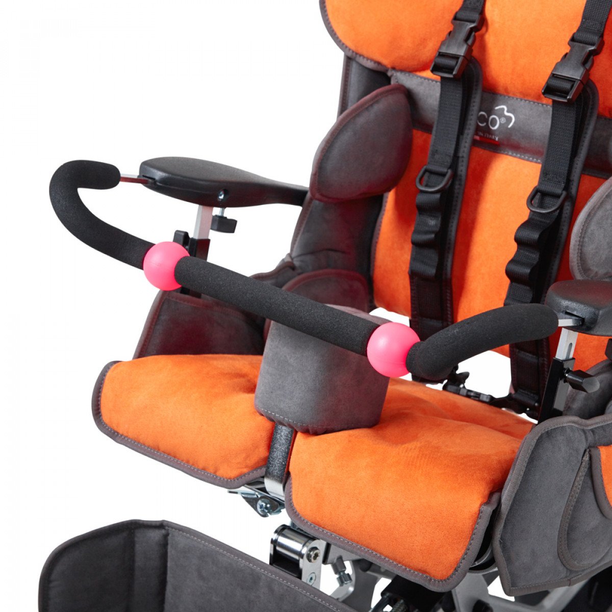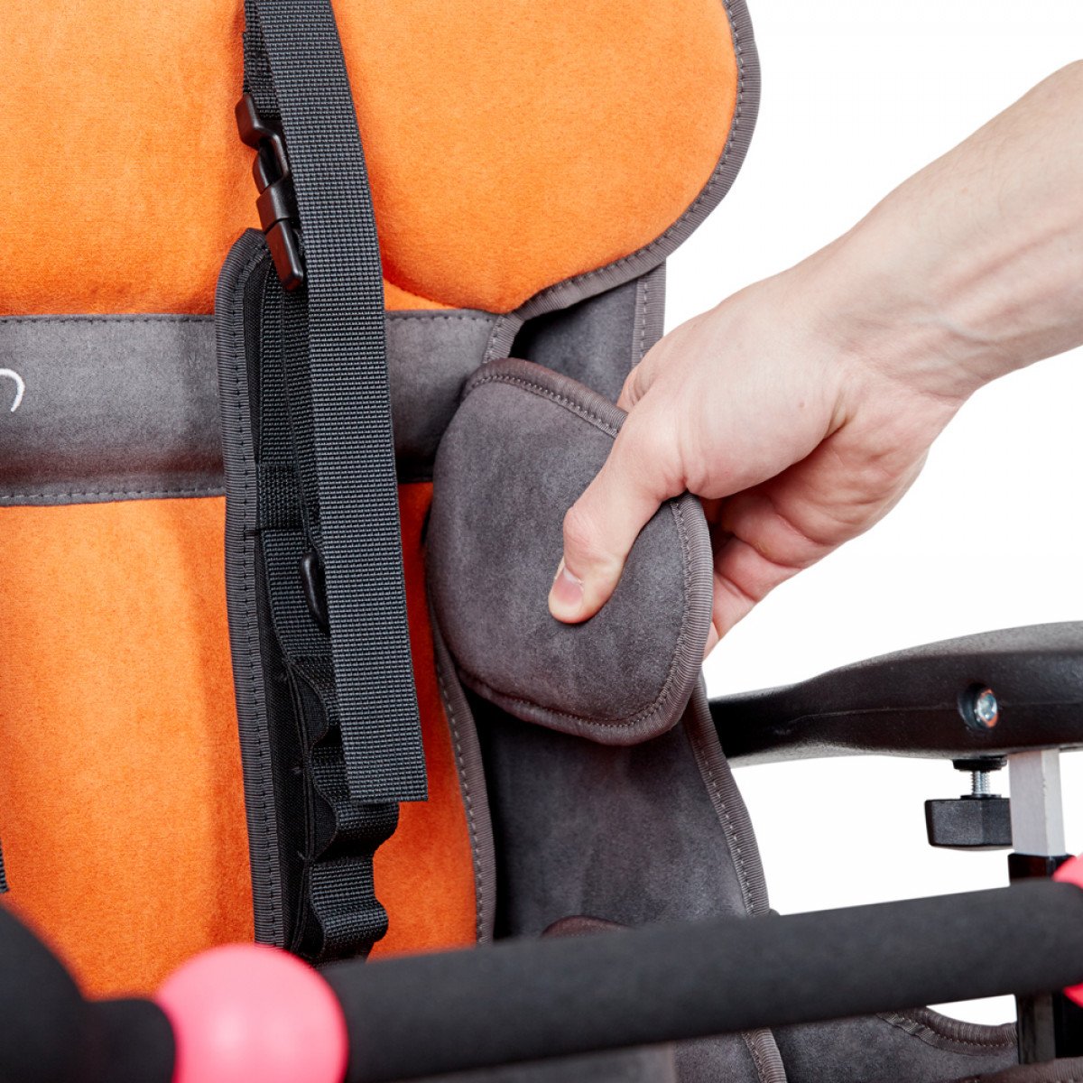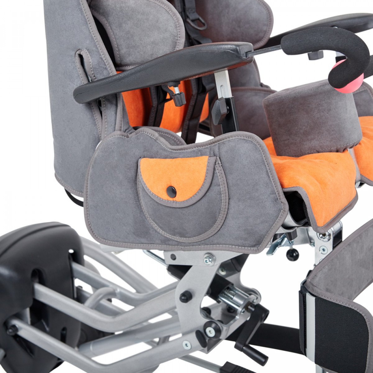 Мягкая дышащая обивка кресла снимается и легко чистится. Для комфортного пребывания предусмотрена встроенная подушка против пролежней. Средний слой обшивки амортизирует движения ребёнка, а внутренний слой оснащен боковыми поддержками. Имеется мягкий регулируемый абдуктор, а функциональный подголовник Shapeable регулируется по высоте, глубине и углу наклона.