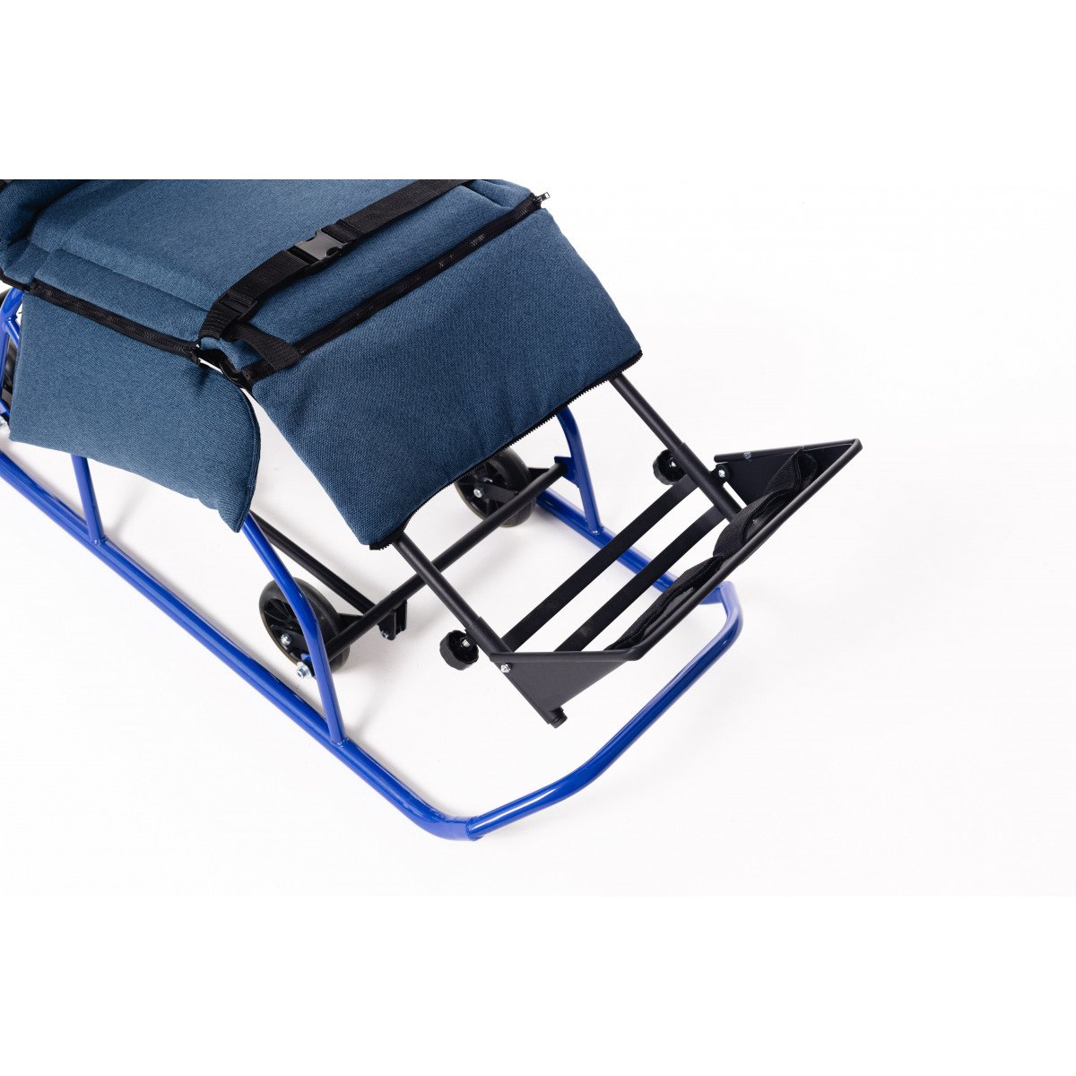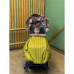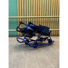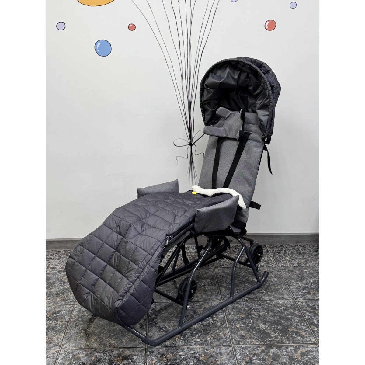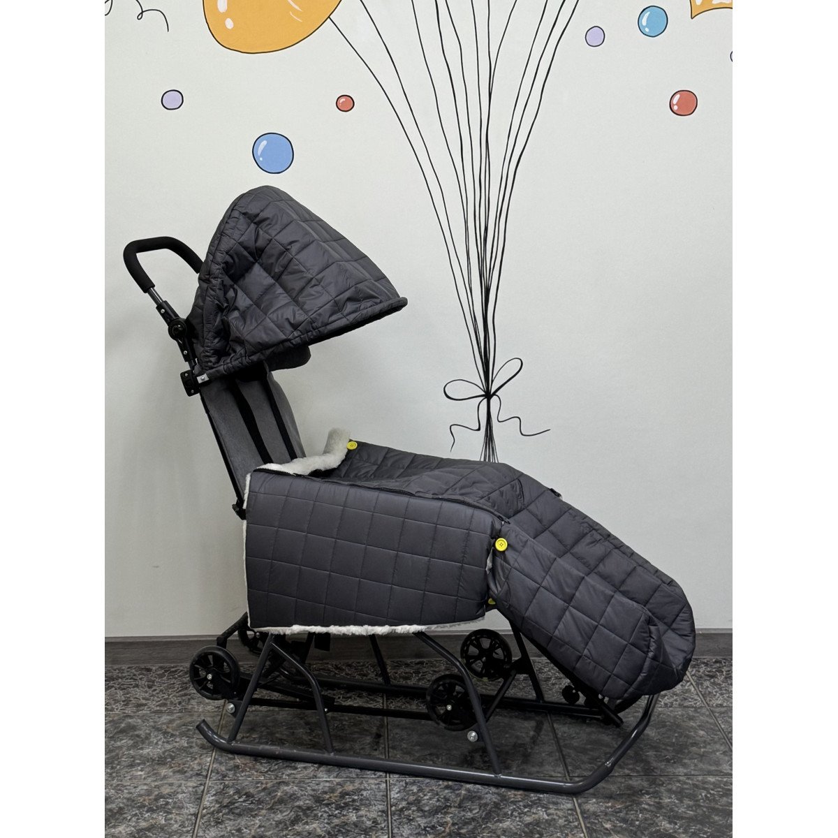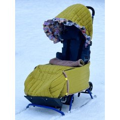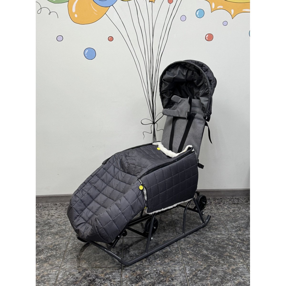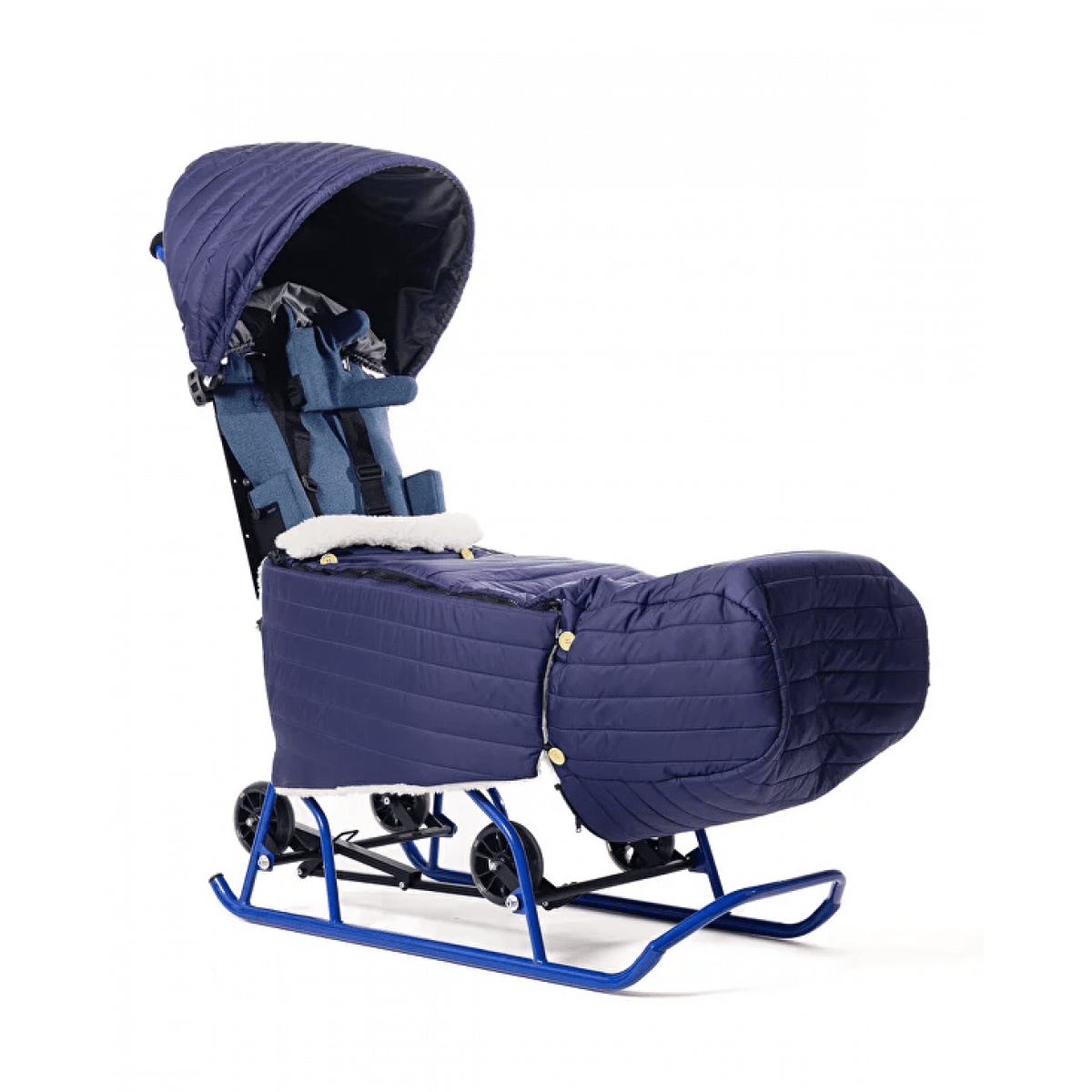 Конструкция санок продумана до мелочей: регулируемая спинка и подножка позволяют подобрать удобное положение для ребёнка. Чехол изготовлен из прочного влагозащитного материала болонья, который надёжно защищает от ветра и осадков. Внутренний подклад из искусственного меха (овчины) сохраняет тепло и создаёт уют даже в морозную погоду.