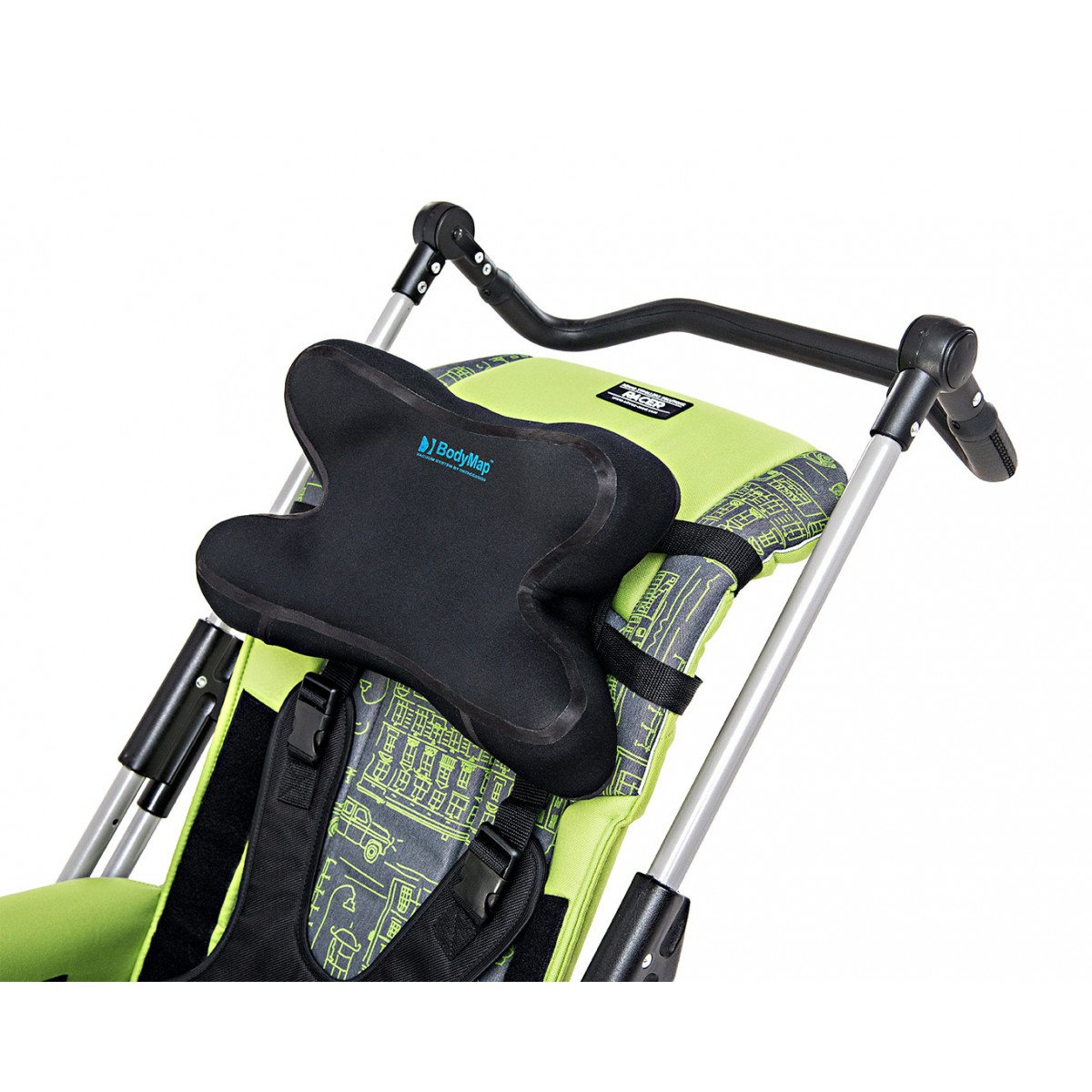 Подголовник BodyMap DX покрыт эластичным полиэcтром высокого качества. Снизу у него находится покрытие из велкроткани и две поперечки. Благодаря этому можно пристегнуть разнообразные ремни на липучках Velcro, что позволит зафиксировать пациента в подушке или установить подушку в любом месте, например, в коляске, кресле или автомобиле. Поверхность их велкроткани также предотвращает самопроизвольное перемещение подголовника. В случае использования продукта на больничной койке рекомендуется использовать специальную простыню REH4MAT, снабжённую покрытием из велкроткани.